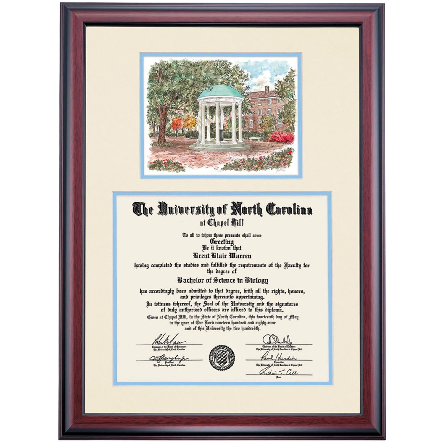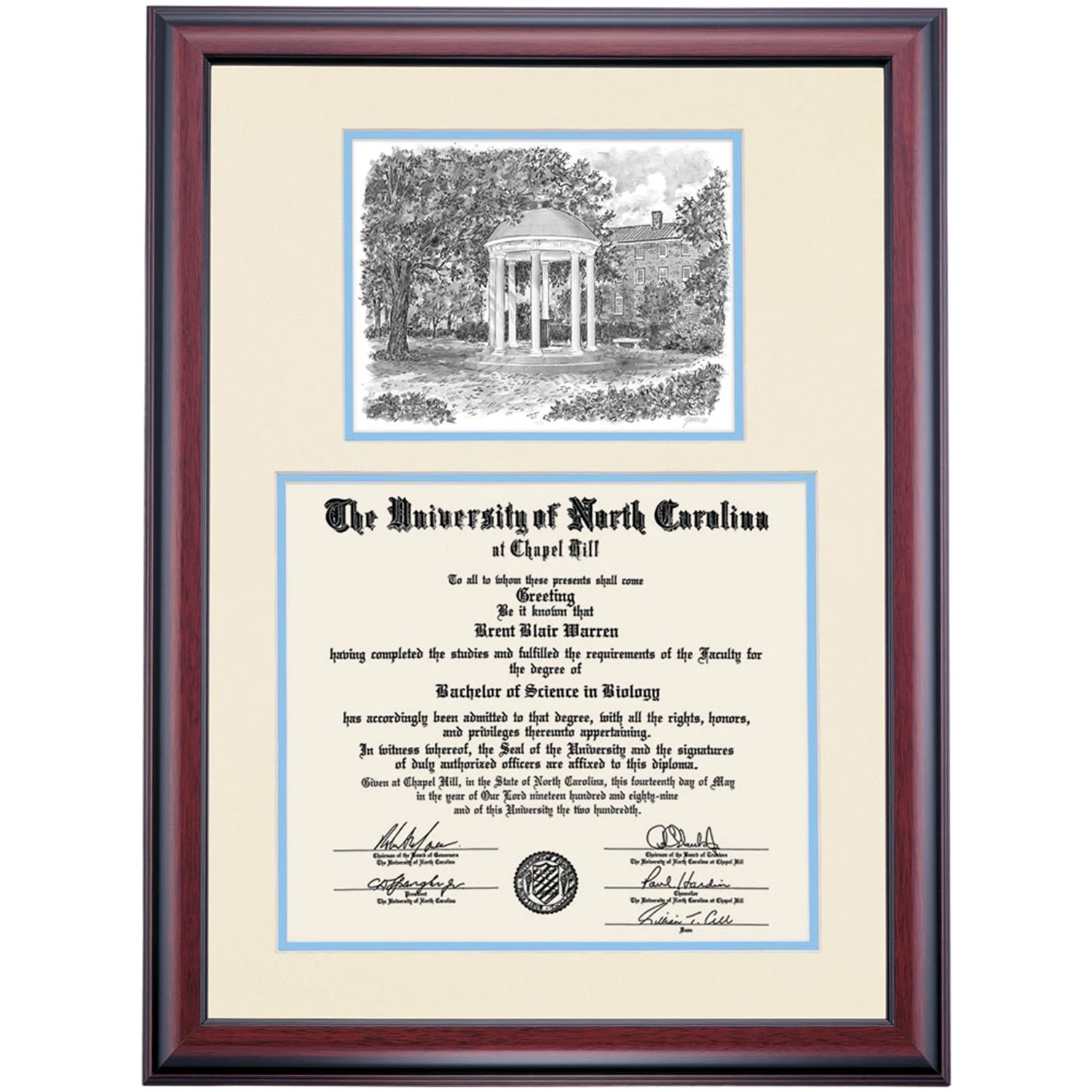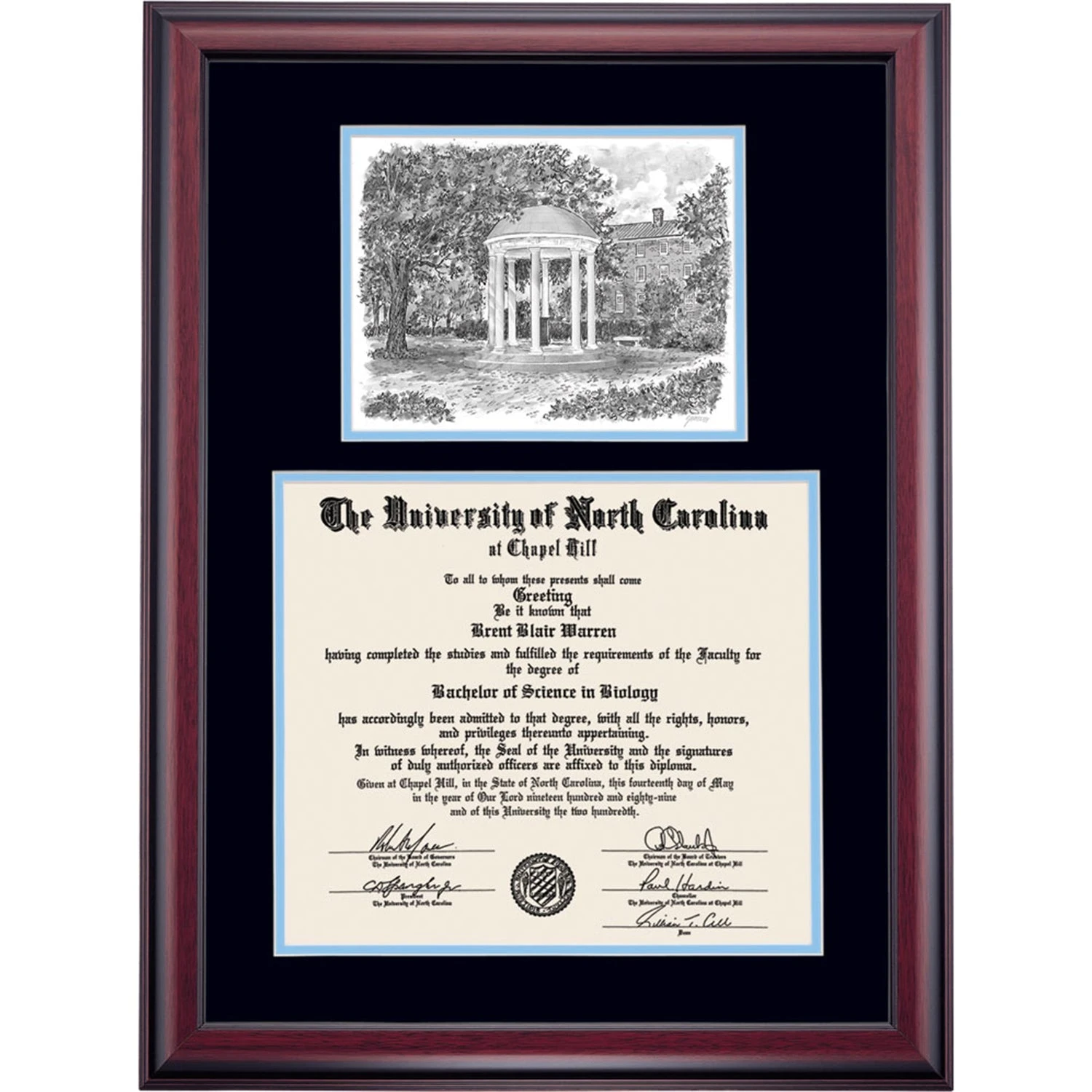 Celebrate your graduation in style with this handcrafted premier diploma frame which includes a Professional Print of The Old Well. Custom crafted to fit your University of North Carolina at Chapel Hill diploma, this frame features accent matting and high quality hardwood moulding.