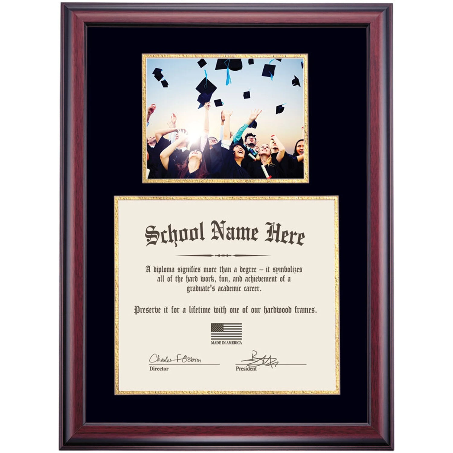 Celebrate your graduation in style with this handcrafted diploma frame. Custom crafted to fit your 11 x 14 horizontal diploma with an opening for your own 8 x 10 horizontal photograph, this frame features Black and Gold accent matting and high quality hardwood moulding.