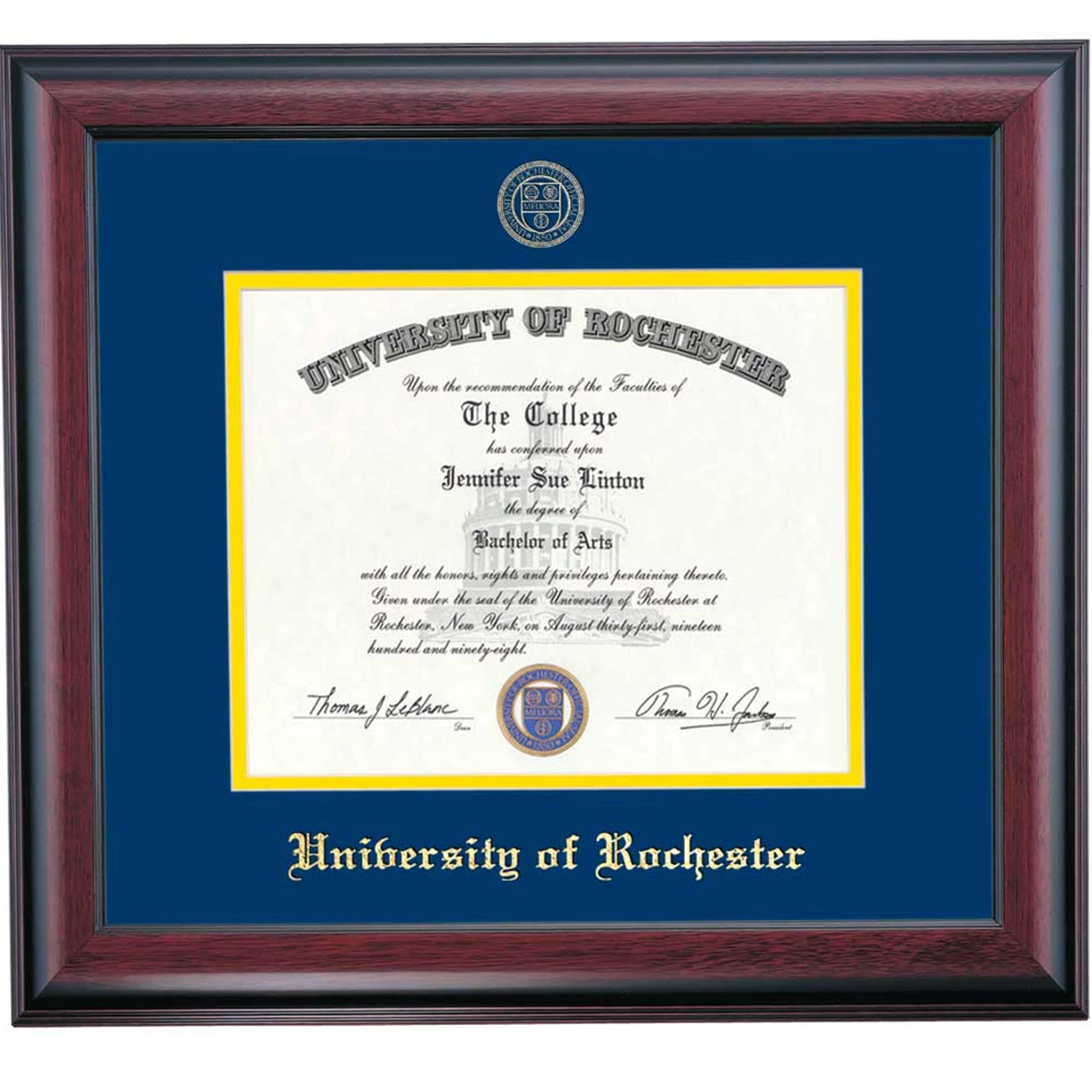 Celebrate your graduation in style with this handcrafted diploma frame. Custom crafted to fit your University of Rochester diploma, this frame is embossed with your school name and seal and features Navy/Yellow accent matting and high quality hardwood moulding.