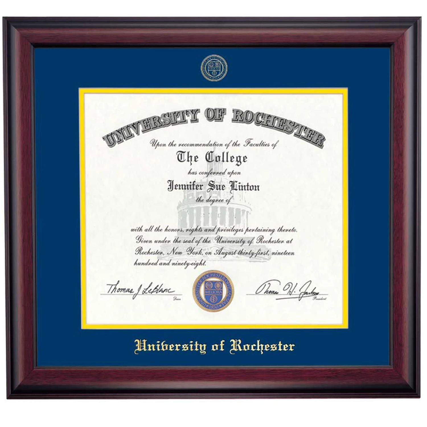 Celebrate your graduation in style with this handcrafted diploma frame. Custom crafted to fit your University of Rochester graduate diploma, this frame is embossed with your school name and seal and features Navy/Yellow accent matting and high quality hardwood moulding.