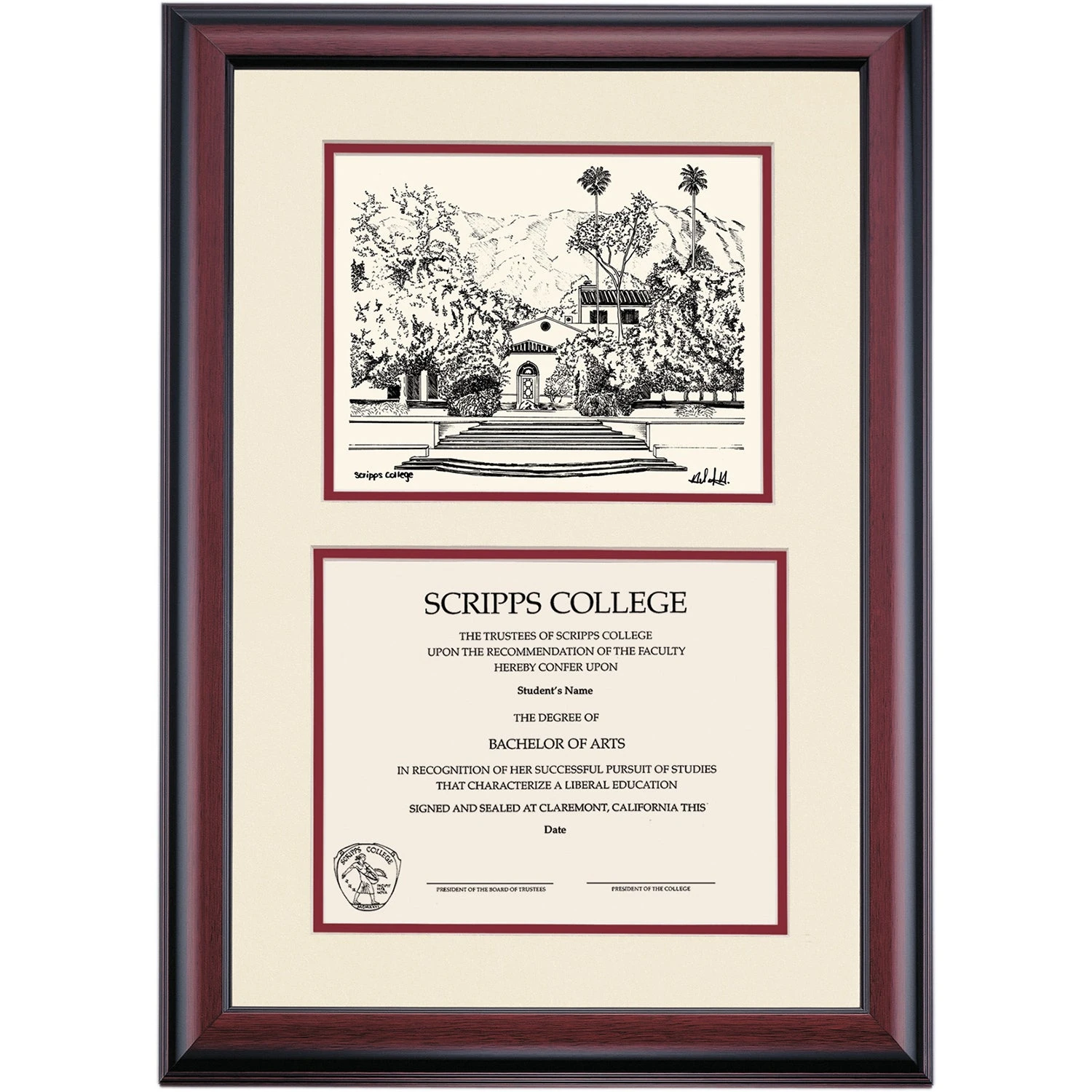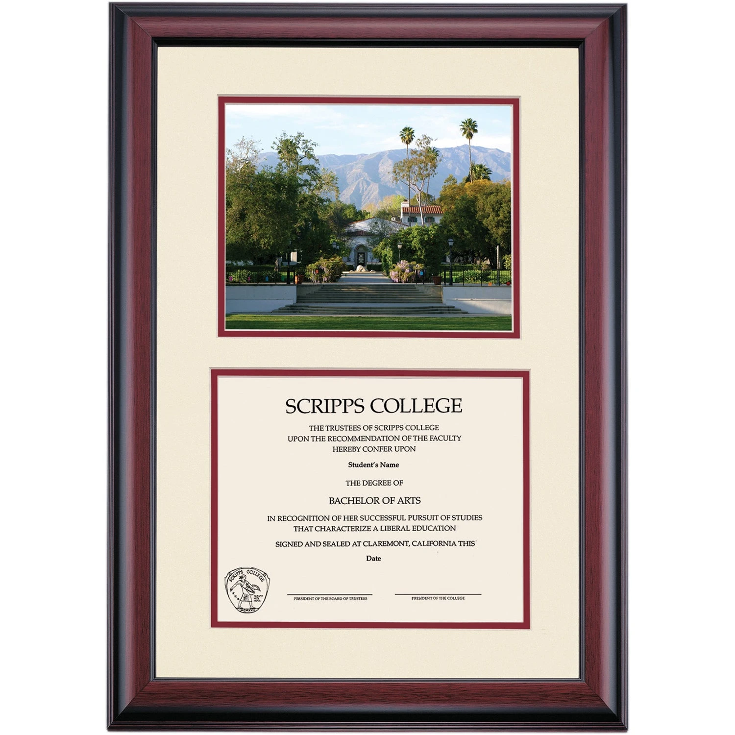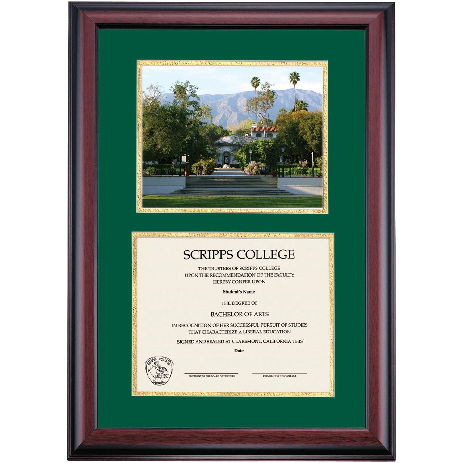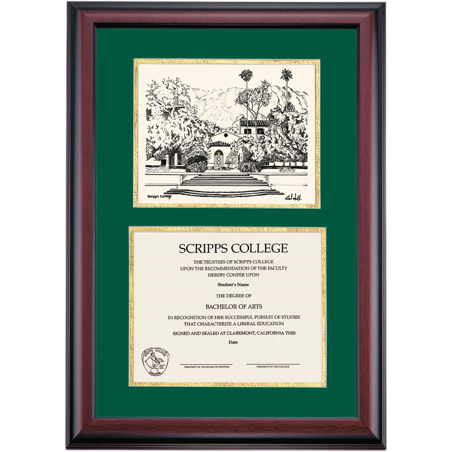 Celebrate your graduation in style with this handcrafted premier diploma frame which includes a Professional Print of Toll Hall. Custom crafted to fit your Scripps College diploma, this frame features accent matting and high quality hardwood moulding.
