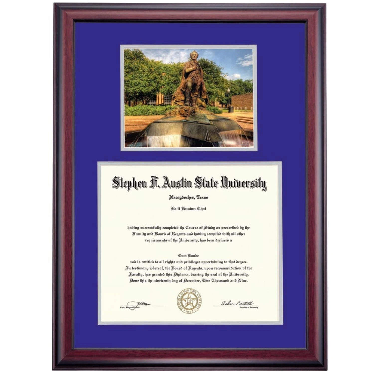 Celebrate your graduation in style with this handcrafted premier diploma frame which includes a Professional Photograph of the Stephen F. Austin Statue. Custom crafted to fit your Stephen F. Austin State University diploma, this frame features accent matting and high quality hardwood moulding.