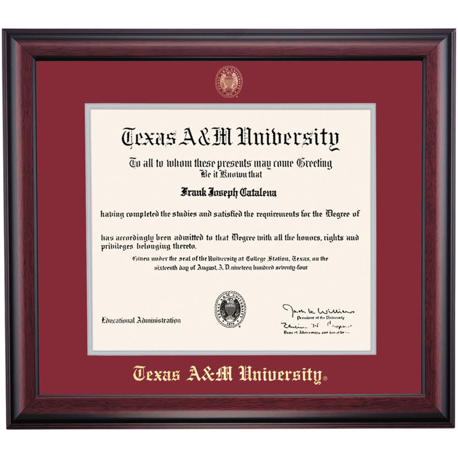 Celebrate your graduation in style with this handcrafted diploma frame. Custom crafted to fit your Texas A&M University diploma, this frame is embossed with your school name and seal and features Maroon/Grey accent matting and high quality hardwood moulding.