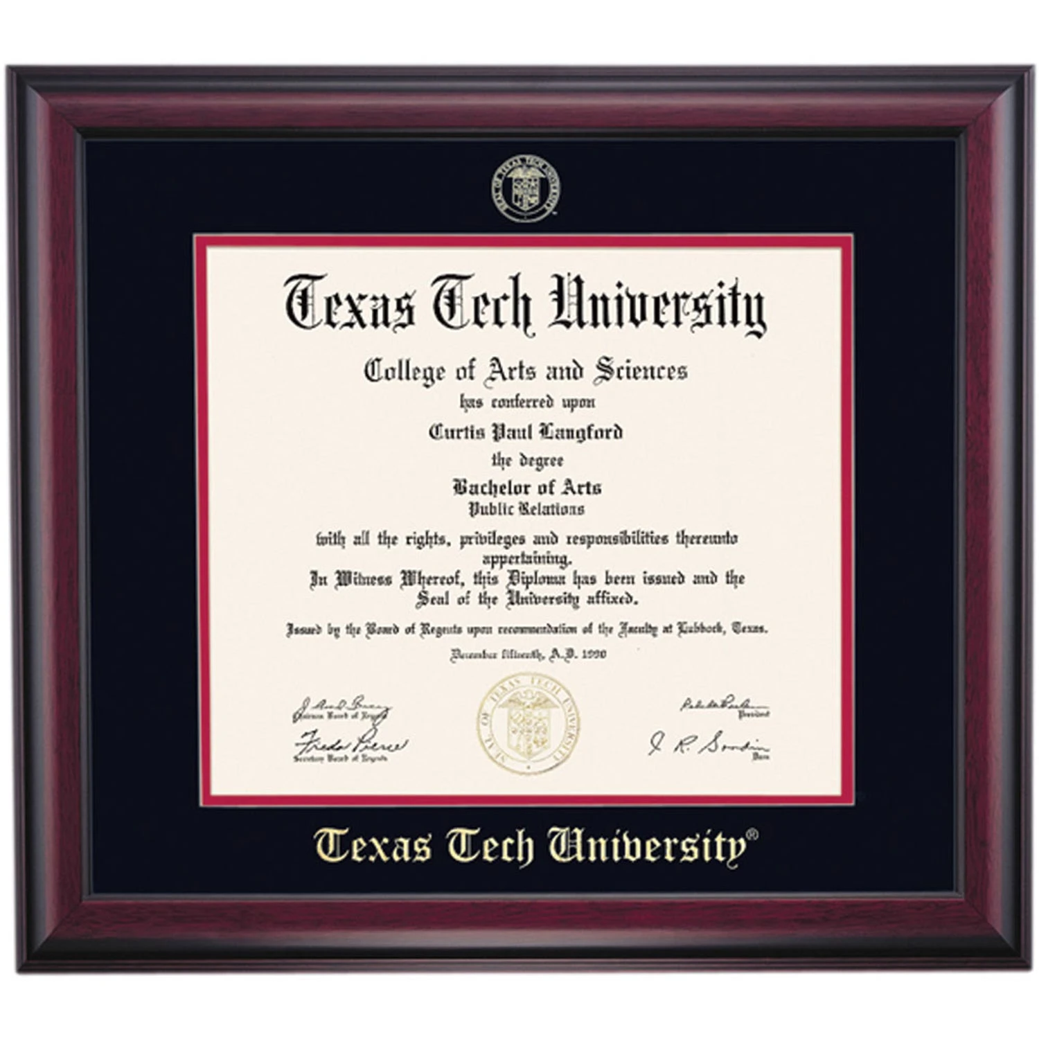 Celebrate your graduation in style with this handcrafted diploma frame. Custom crafted to fit your Texas Tech University law diploma, this frame is embossed with your school name and seal and features Black/Cherry accent matting and high quality hardwood moulding.