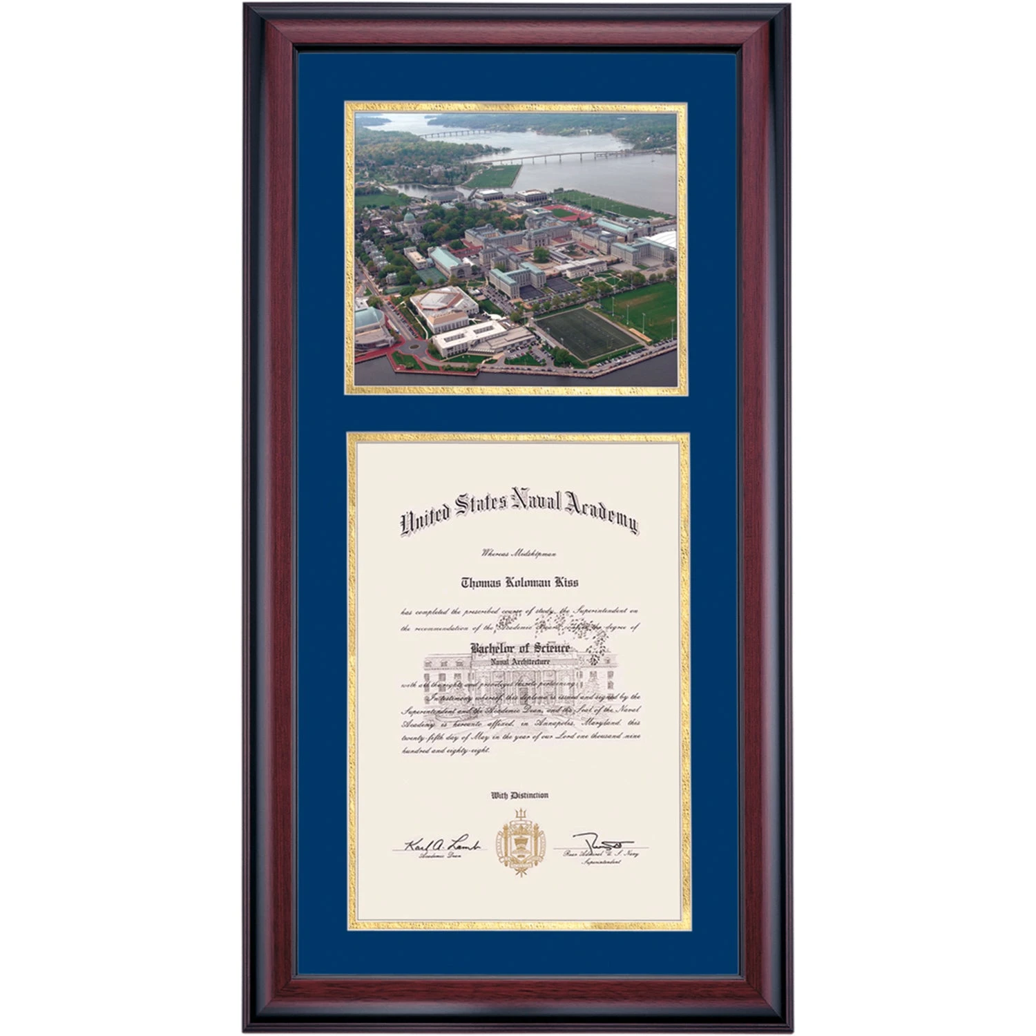 Celebrate your graduation in style with this handcrafted premier diploma frame which includes a Professional Aerial View of the Naval Yard Photograph. Custom crafted to fit your United States Naval Academy diploma or Commissioning Warrant, this frame features Navy/Gold accent matting and high quality hardwood moulding.