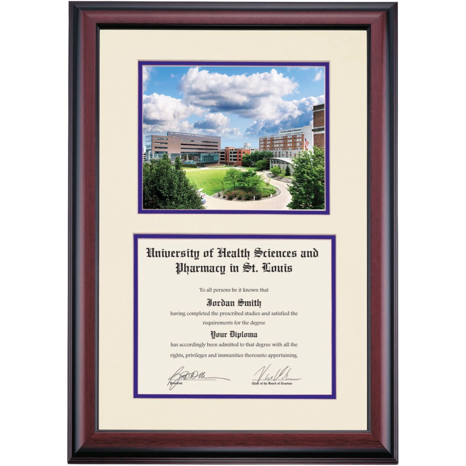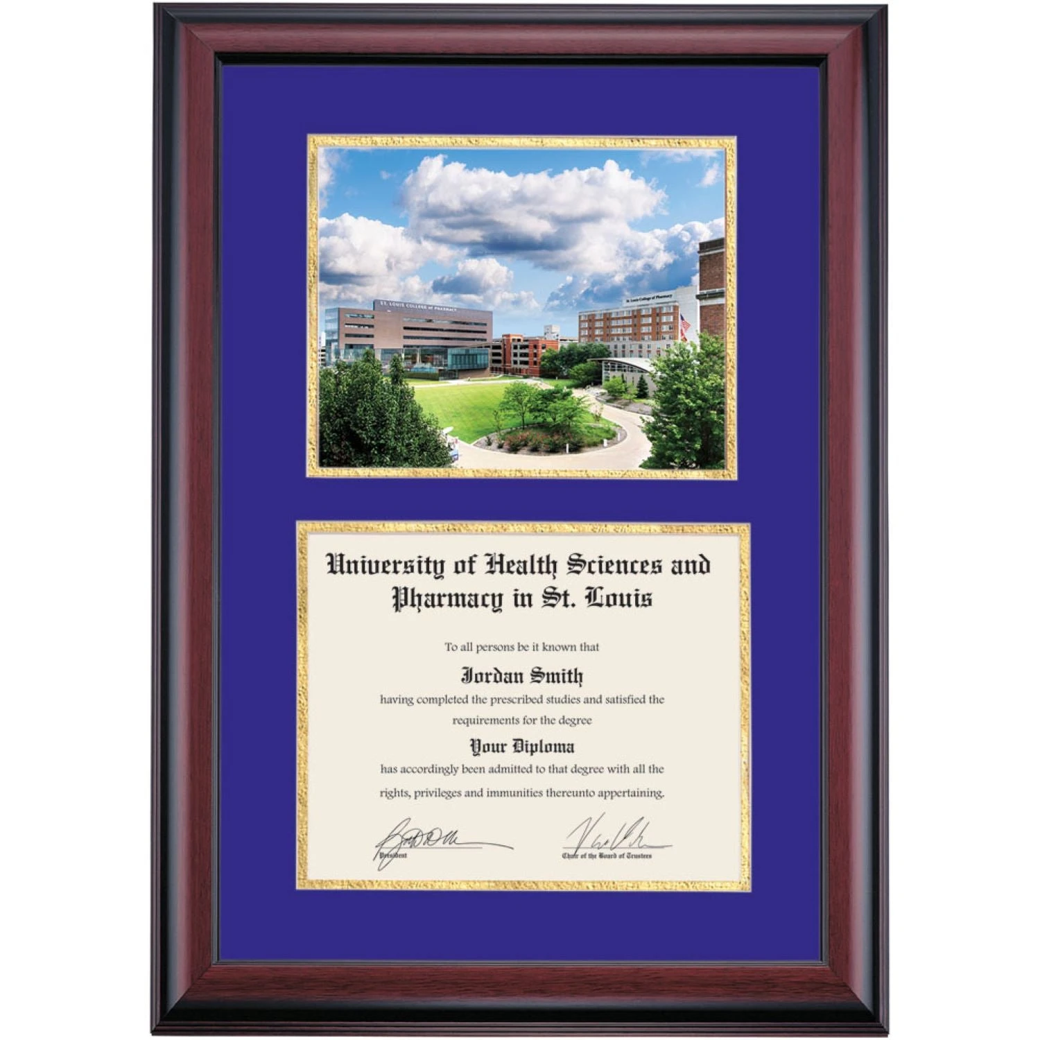 Celebrate your graduation in style with this handcrafted premier diploma frame which includes a Professional Photograph of the College Quad. Custom crafted to fit your University of Health Sciences and Pharmacy in St. Louis diploma, this frame features accent matting and high quality hardwood moulding.