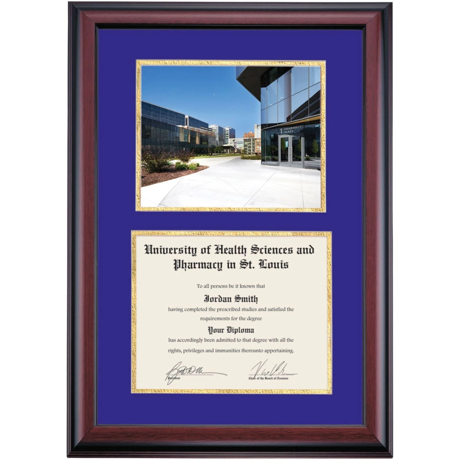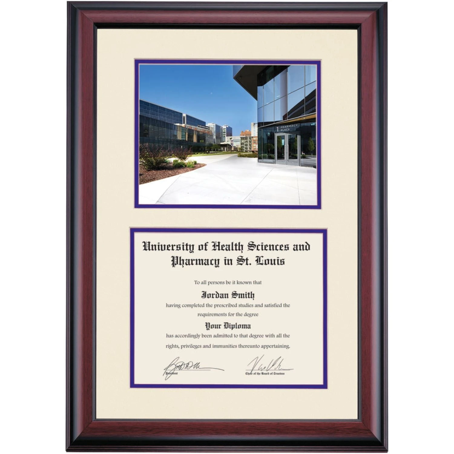 Celebrate your graduation in style with this handcrafted premier diploma frame which includes a Professional Photograph of the Pharmacy Place. Custom crafted to fit your University of Health Sciences and Pharmacy in St. Louis diploma, this frame features accent matting and high quality hardwood moulding.