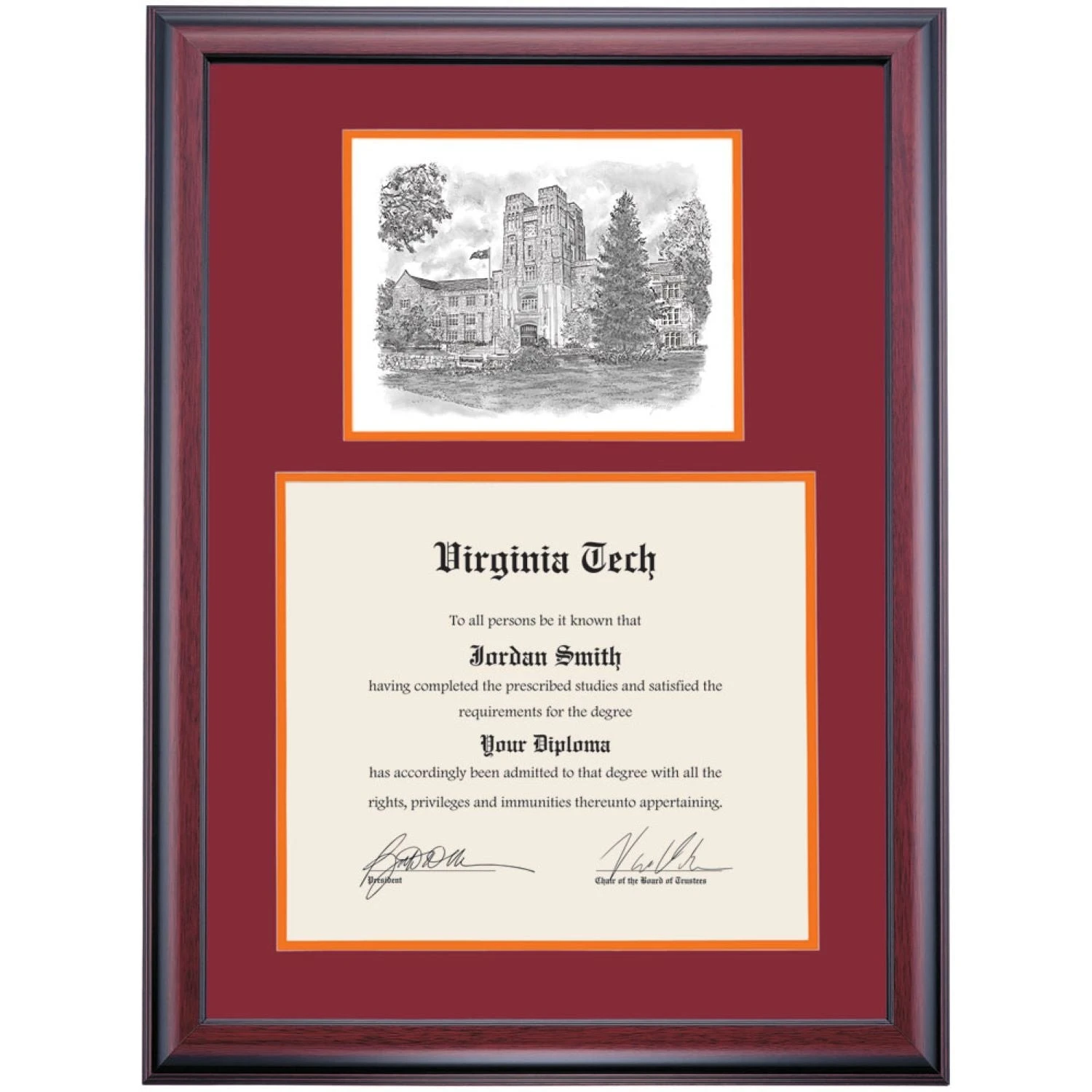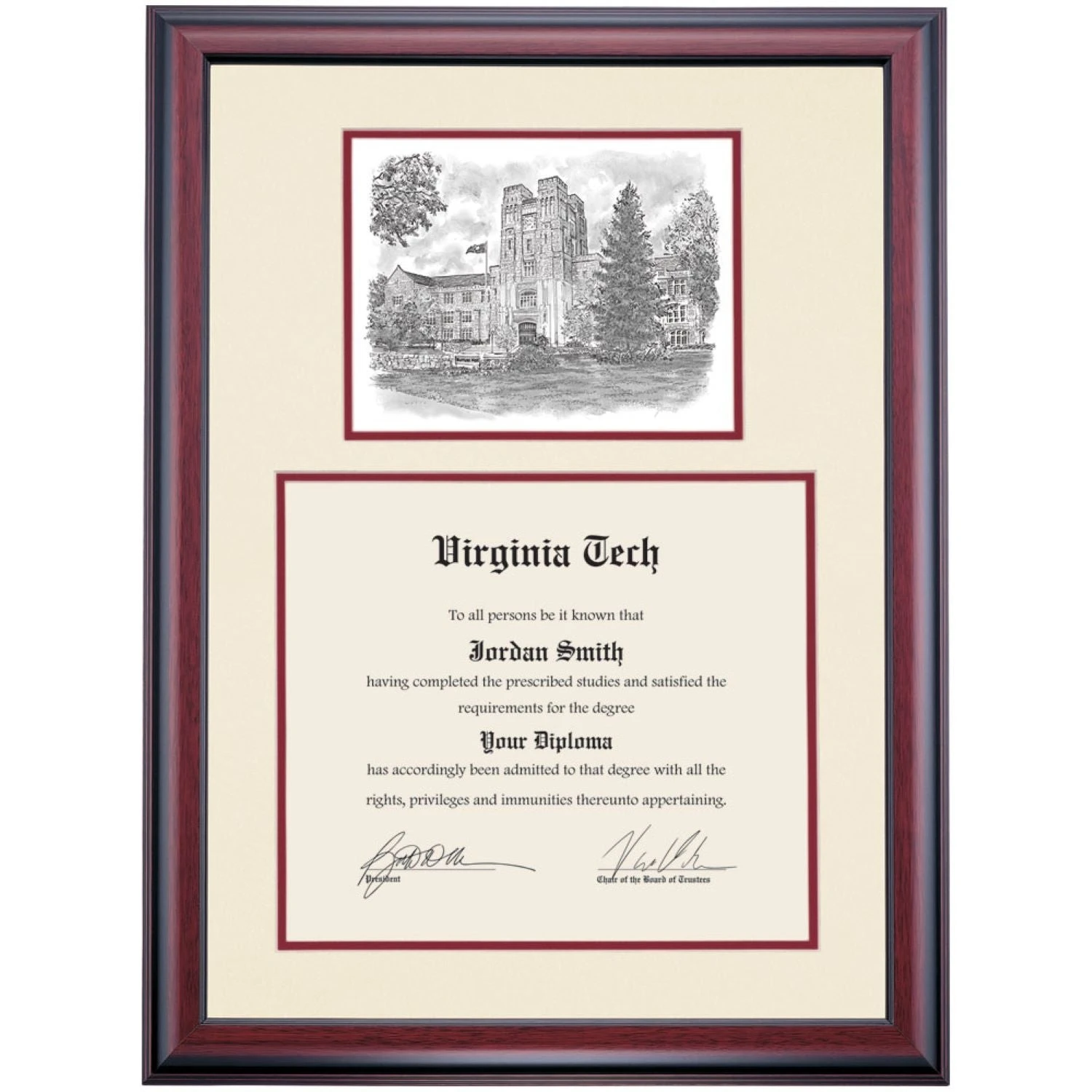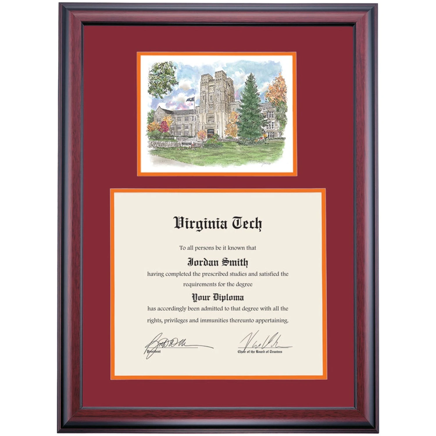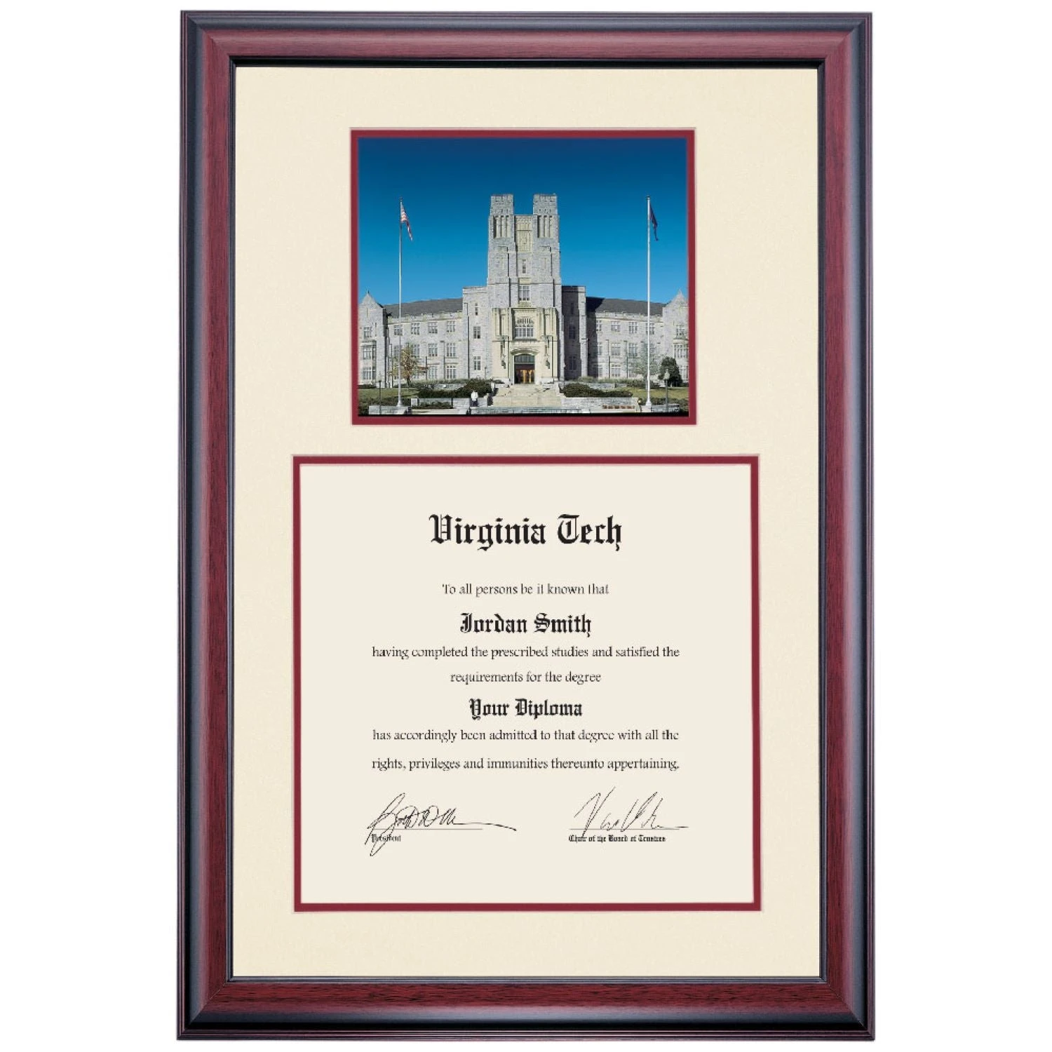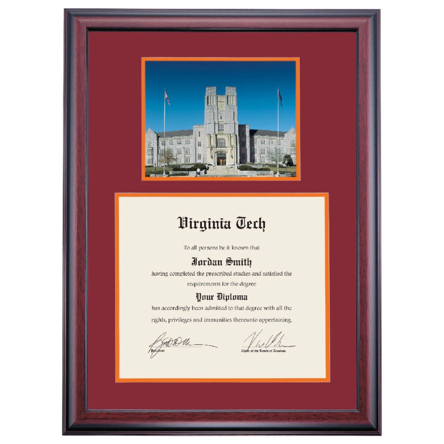 Celebrate your graduation in style with this handcrafted premier diploma frame which includes a Professional Print of Burruss Hall. Custom crafted to fit your Virginia Tech diploma, this frame features accent matting and high quality hardwood moulding.