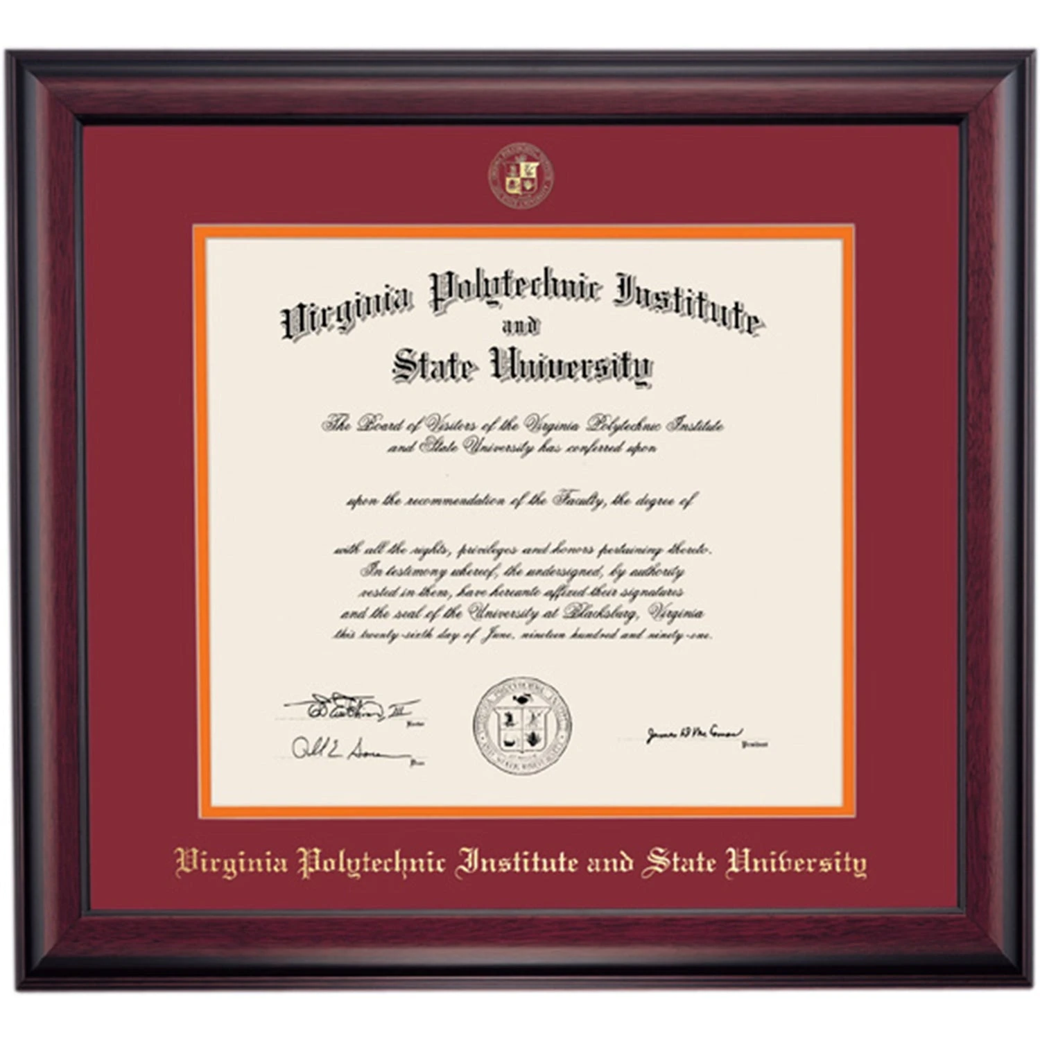Celebrate your graduation in style with this handcrafted diploma frame. Custom crafted to fit yourVirginia Tech 11″h x 14″w graduate diploma, this frame is embossed with your school name and seal and features Maroon/Orange accent matting and high quality hardwood moulding.