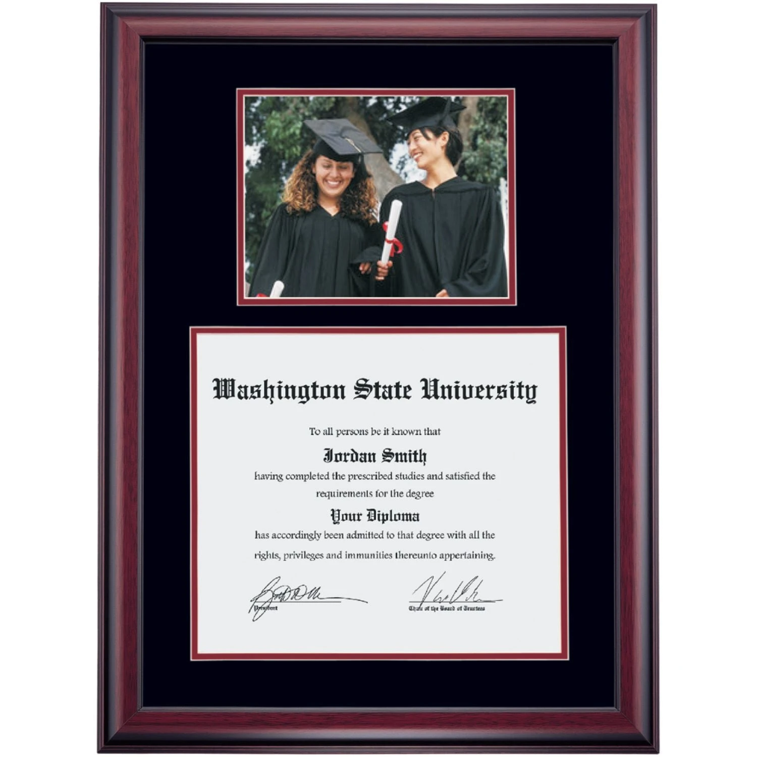 Celebrate your graduation in style with this handcrafted premier diploma frame which includes an opening for an 8×10 photograph (horizontal). Custom crafted to fit your Washington State University diploma, this frame features accent matting and high quality hardwood moulding.