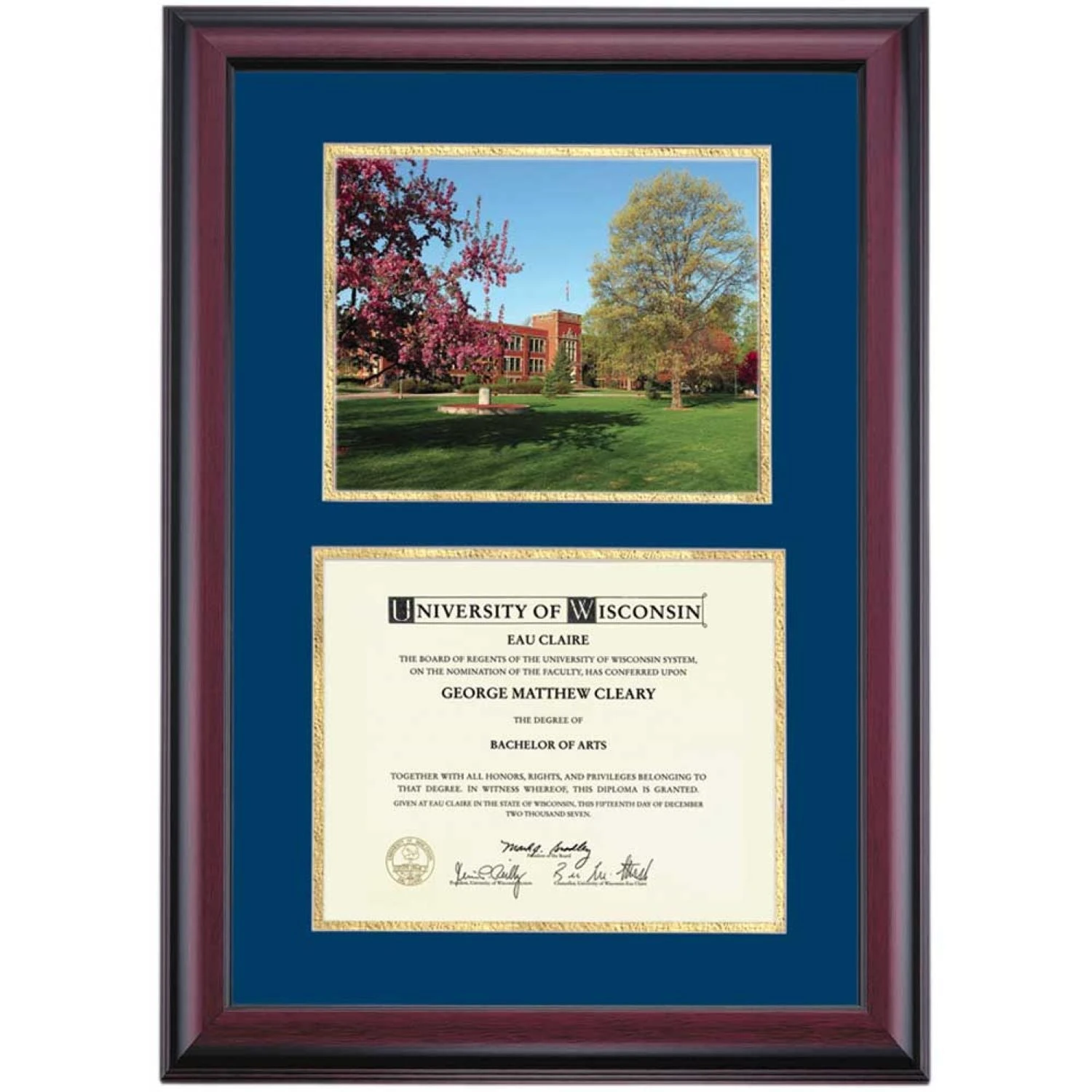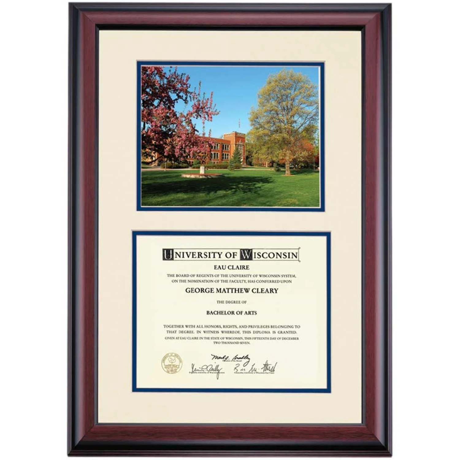 Celebrate your graduation in style with this handcrafted premier diploma frame which includes a Professional Photograph of Schofield Hall. Custom crafted to fit your University of Wisconsin-Eau Claire diploma, this frame features accent matting and high quality hardwood moulding.