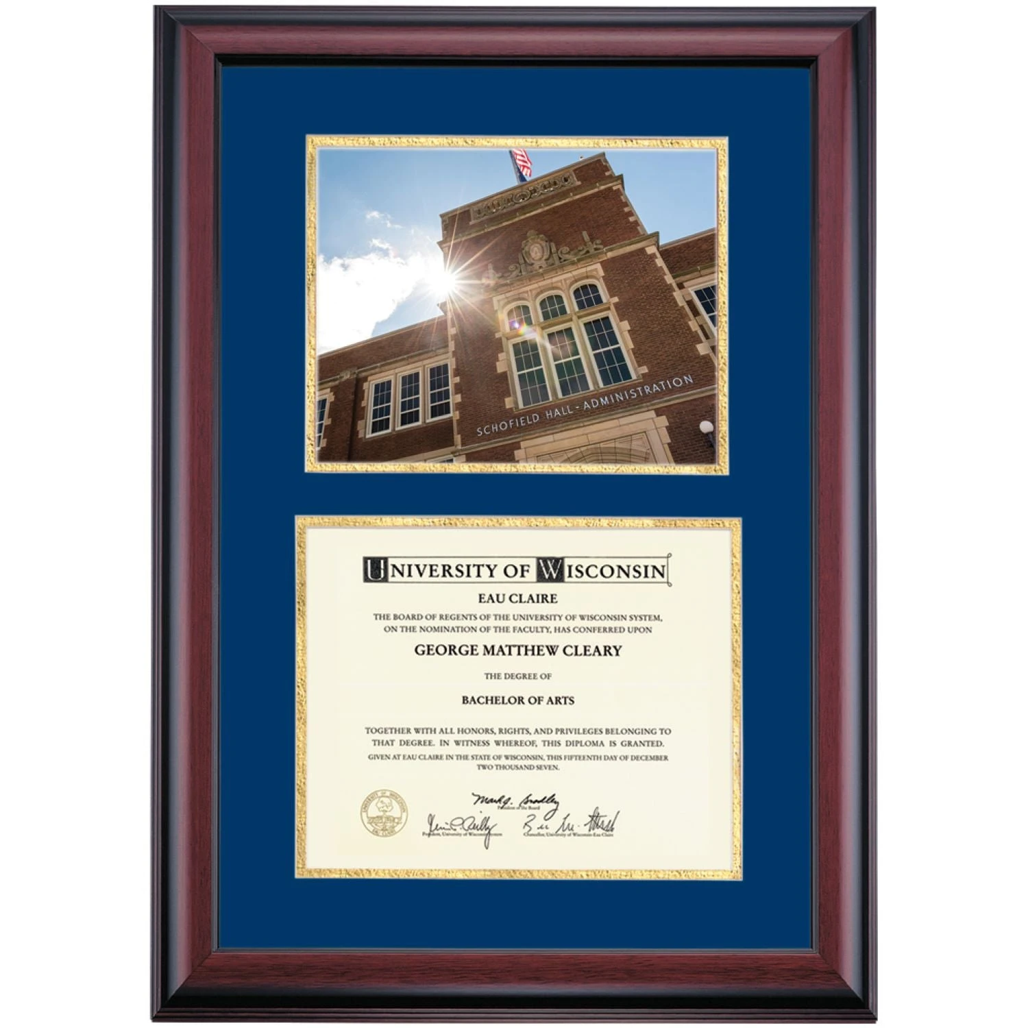 Celebrate your graduation in style with this handcrafted premier diploma frame which includes a Professional Photograph of Schofield Hall. Custom crafted to fit your University of Wisconsin-Eau Claire diploma, this frame features accent matting and high quality hardwood moulding.
