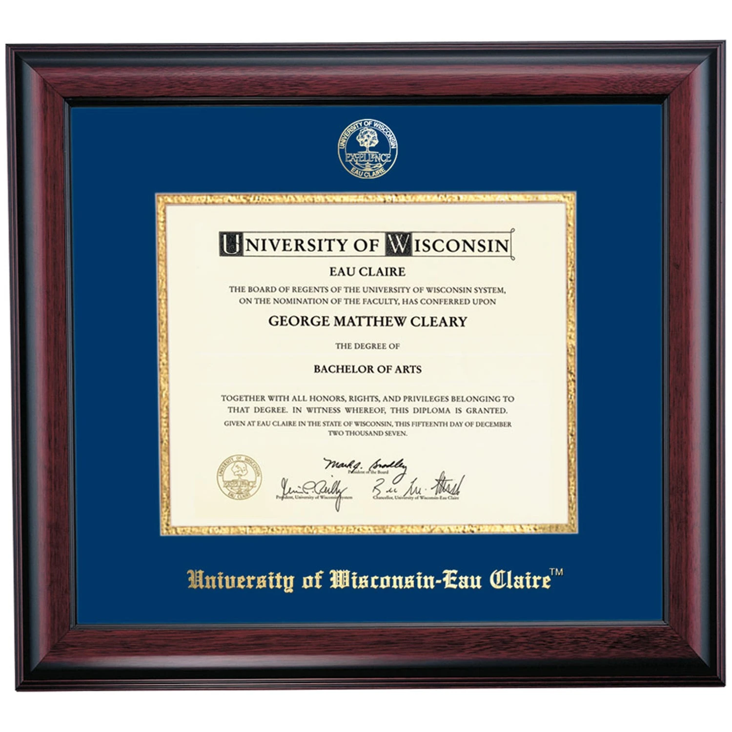 Celebrate your graduation in style with this handcrafted diploma frame. Custom crafted to fit your University of Wisconsin-Eau Claire diploma, this frame is embossed with your school name and seal and features Navy/Gold accent matting and high quality hardwood moulding.