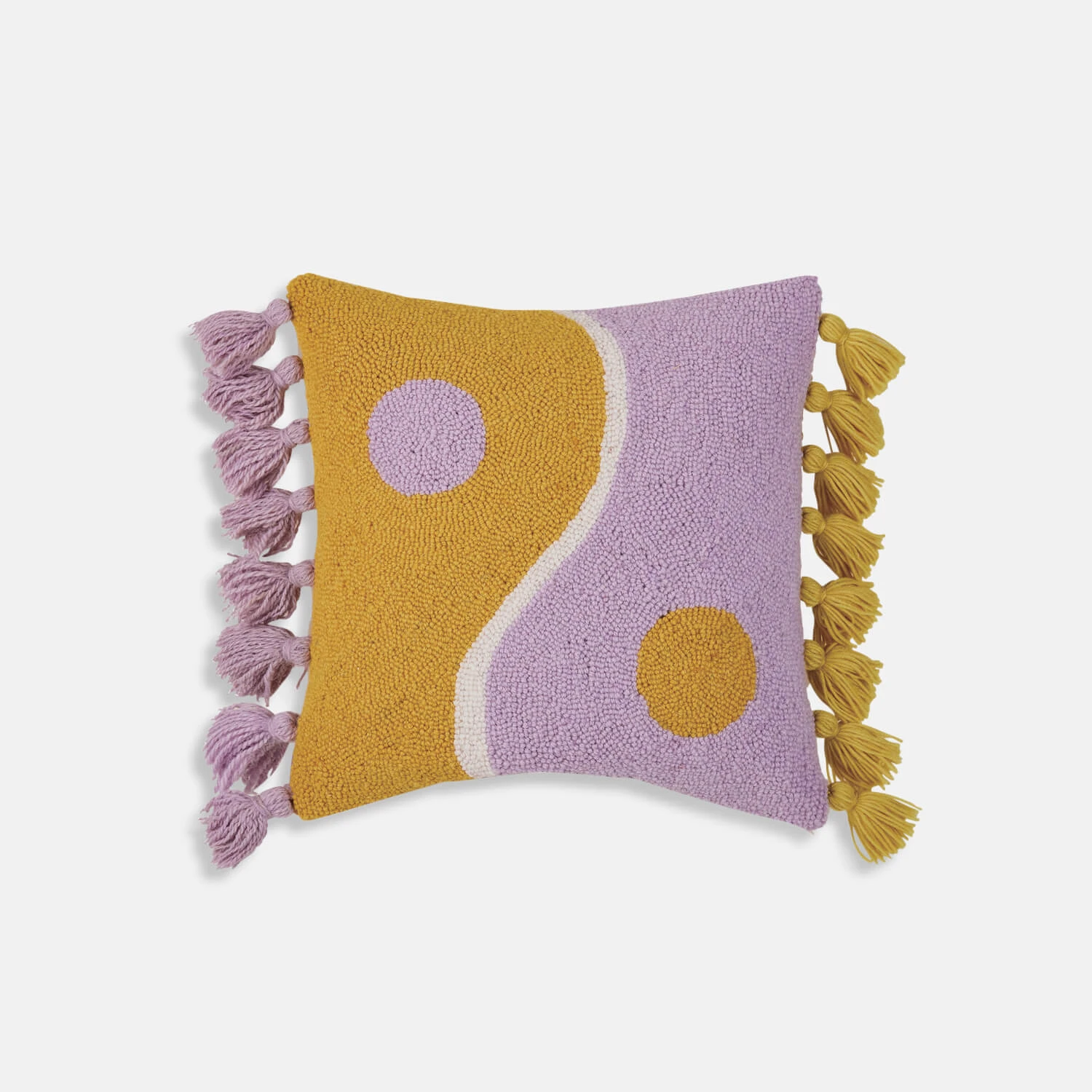 This hooked wool and velvet throw pillow features a classic yin-yang design in trendy colors and fun tassels on the sides.